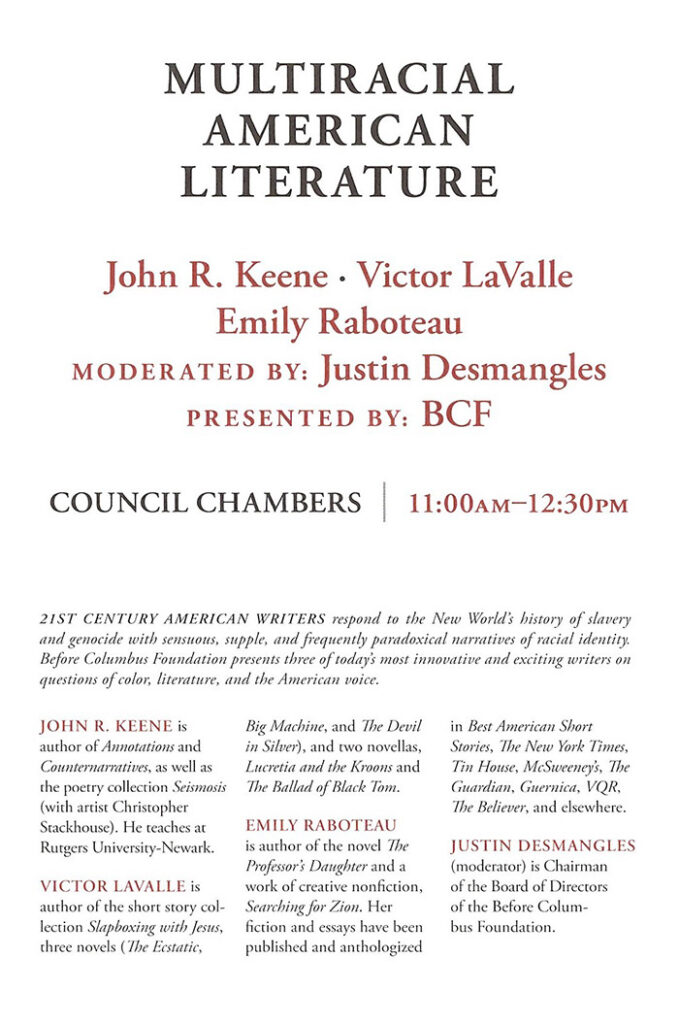 The Before Columbus Foundation was founded in 1976 as a nonprofit educational and service organization dedicated to the promotion and dissemination of contemporary American multicultural literature. The goals of BCF are to provide recognition and a wider audience for the wealth of cultural and ethnic diversity that constitutes American writing. BCF has always employed the term “multicultural” not as a description of an aspect of American literature, but as a definition of all American literature. BCF believes that the ingredients of America’s so-called “melting pot” are not only distinct, but integral to the unique constitution of American Culture-the whole comprises the parts.